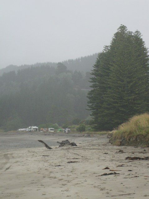 While sitting in the bus on a rainy day at the lovely Waipiro Bay, having been rained off the beach, we had a suitably fitting rainy-day-bus-dinner.
