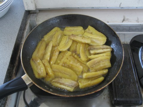Brown sugar and butter simmered and bubbled in the pan while I sliced the bananas and squeezed them all in.