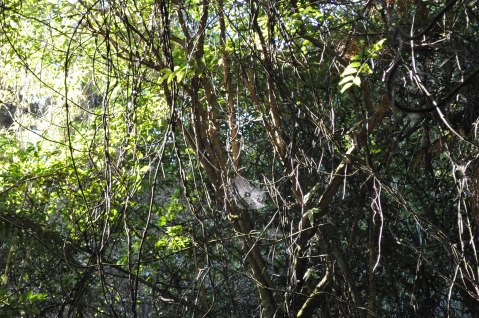 The suns rays catch a delicate spider web hidden amongst the twisted trees